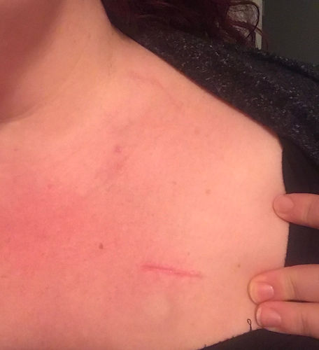 The scars are just red lines & dots. The port popped out a bit on one side, so it’s lop-sided and kindof awkward. I still think it was too long and that it came out a little bit, and that it should probably have been re-seated, but that’s seriously the last thing I need right now.